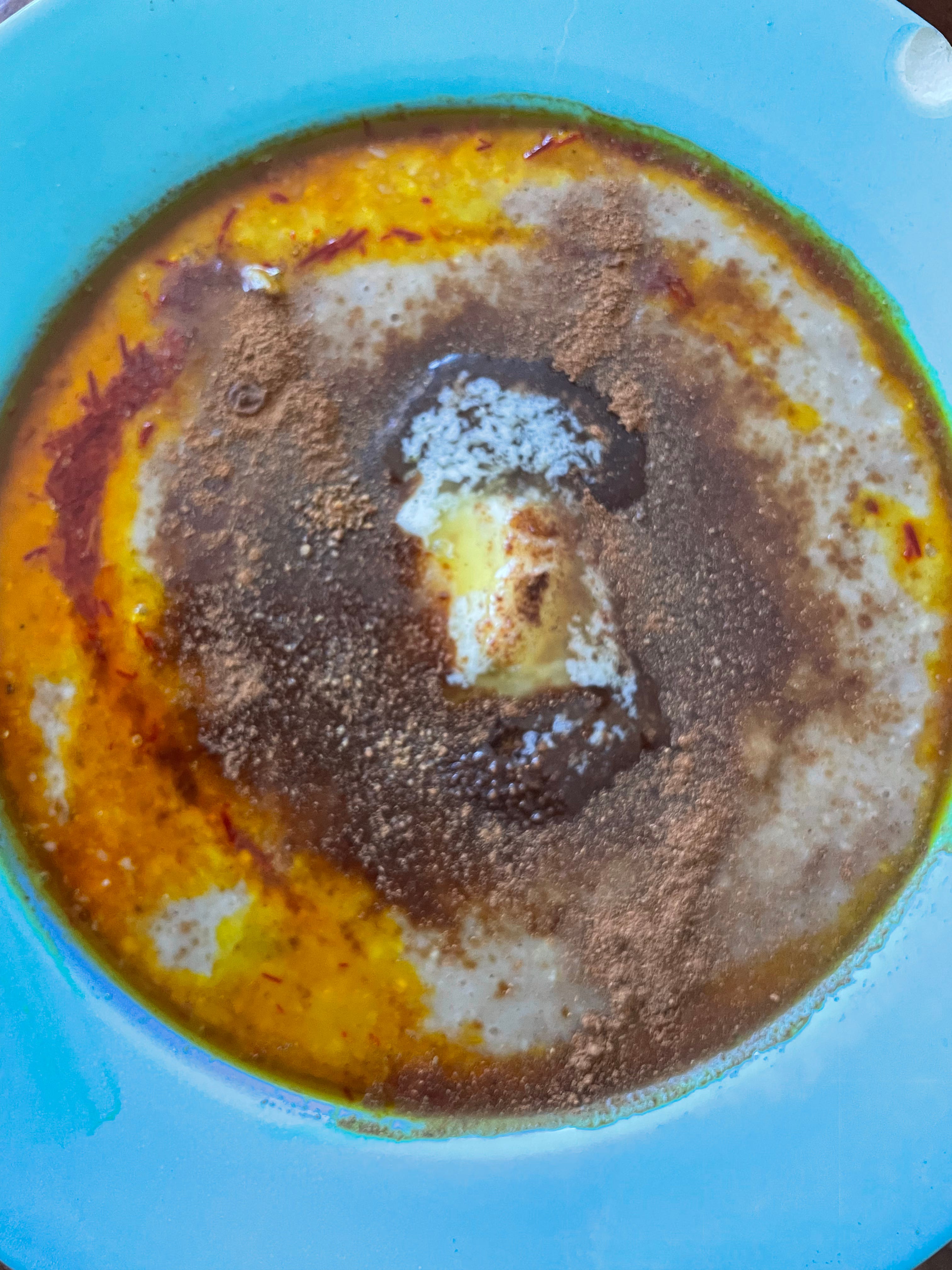Halim can be served to emphasize either side of its sweet-salty spectrum, or both sides together. Common toppings include crispy fried onions, butter/ghee, toasted sesame seeds or walnuts, cinnamon, and sugar (I used coconut sugar). A hit of fire-red saffron infusion that gives a the whole thing a golden sheen.